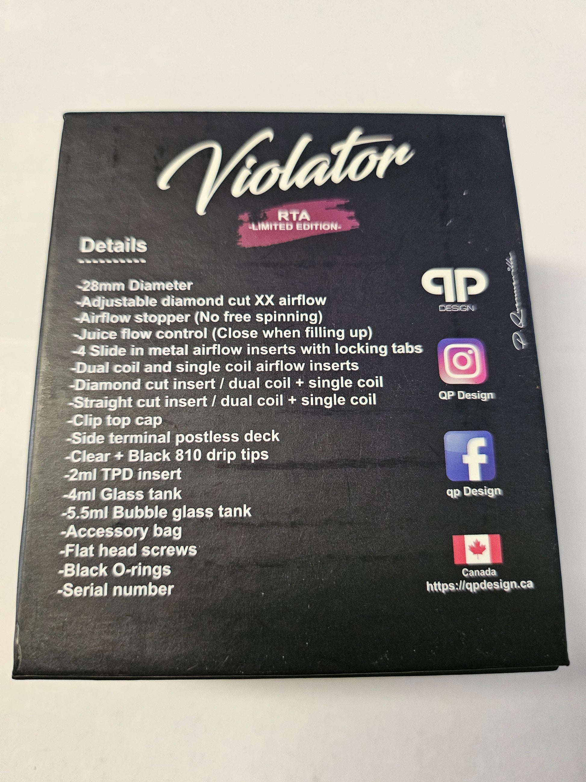 Der VIOLATOR RTA stammt aus der Erfolgsschmiede von QP Design und ist ein hochwertiger,moderner und beeindruckender 28 mm RTA für Single- und Dual-Coil Wicklungen, der seine Stärken im DL-Bereich voll ausfährt und einen Mega guten Geschmack mit großen und dichten Wolken liefert. Seine einzigartige XX Bottom-AFC mit ihren zahlreichen Lufteinlässen im Diamond-Cut versorgt die Wicklung(en) mit ausreichend Luftzufuhrt und mit den 4 wechselbaren Airflow-Inserts aus Metall kann der Dampfer den Luftstrom zusätzlich direkt unter der Coil auf dem großzügigen und komfortablen Postless-Wickeldeck noch weiter anpassen und auf sein Setup perfekt auslegen.
