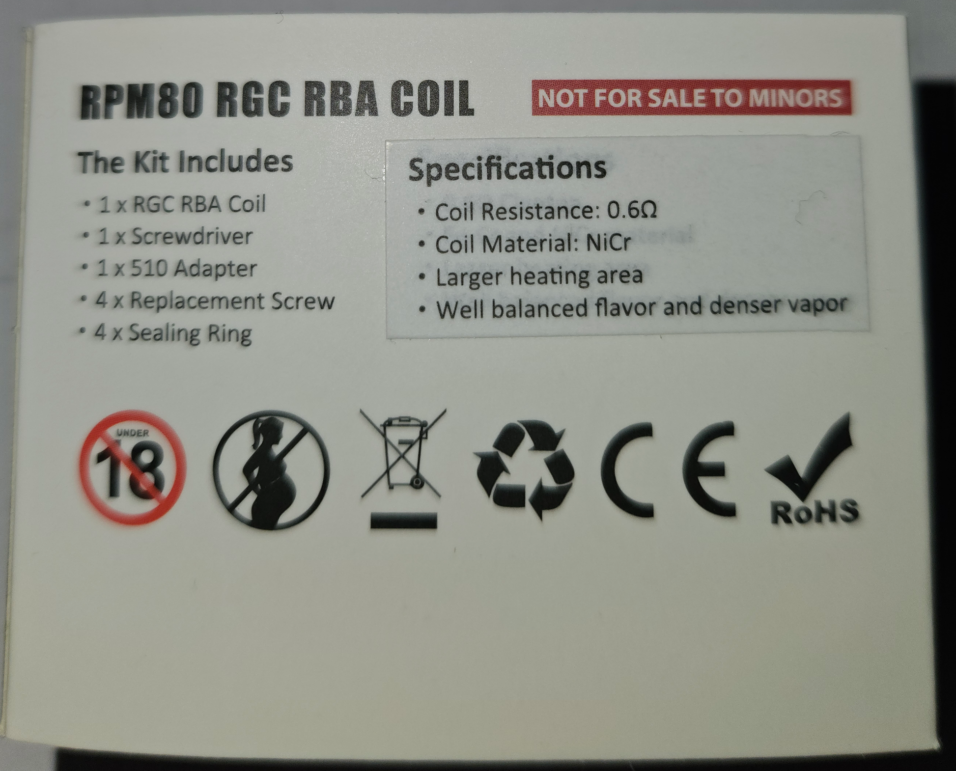 - Für das RPM80 Pod System Kit wurden die RGC Mesh 0,6Ohm Coil und die RGC RBA entwickelt. Die RGC Mesh 0,6Ohm Coil sorgt für ein leistungsstarkes Dampfverhalten und einem warmen Throat Hit mit intensiver Dampfentwicklung. Vor allem aber überzeugt diese Coil mit einem wirklich sehr Intensiven Geschmackserlebnis.